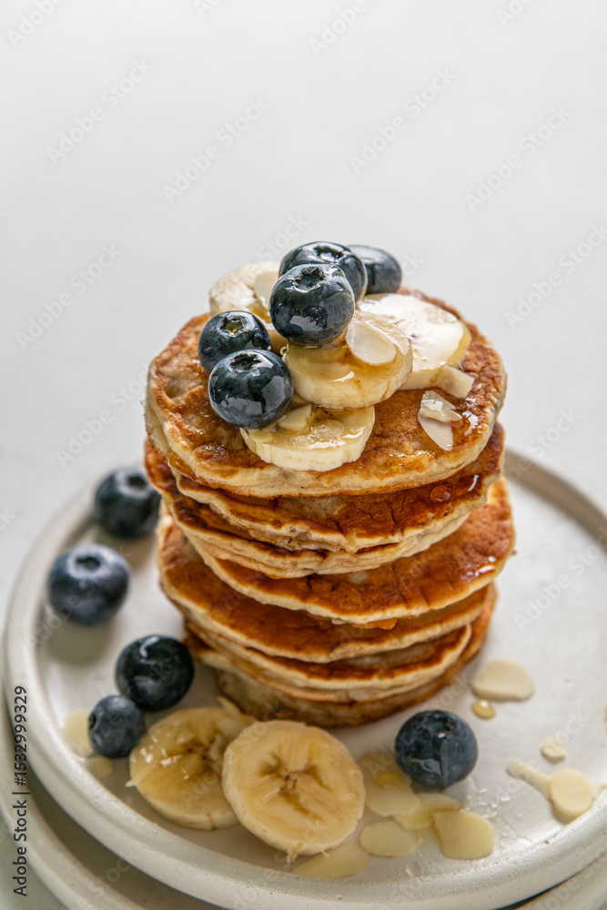 Stack of American banana pancakes with fresh blueberries, honey and almond petals. Healthy eating. Morning tasty homemade breakfast. Top view, selective focus.