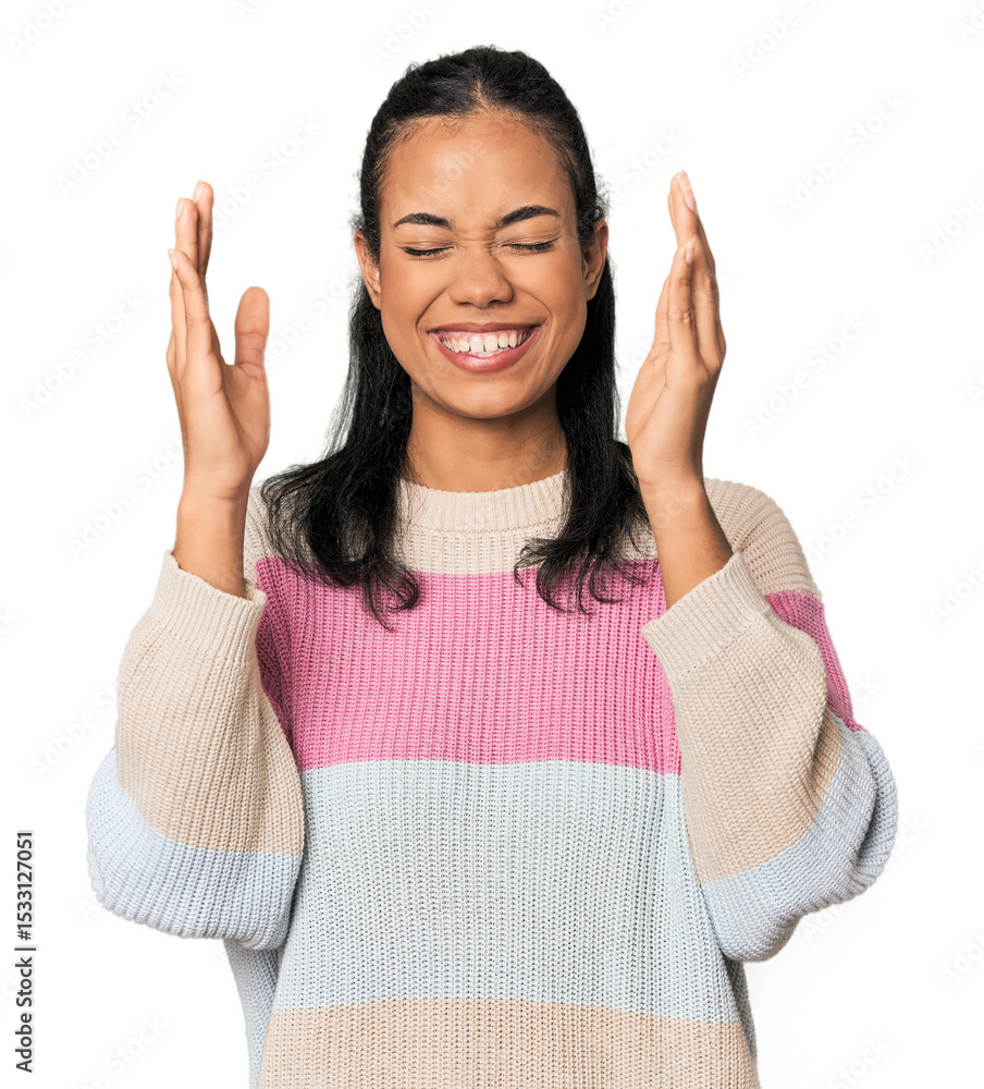 Young Filipina woman laughing about something, covering mouth with hands.