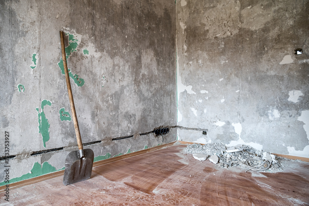 shovel leaning against an old wall. apartment under reconstruction. making new electricity in house