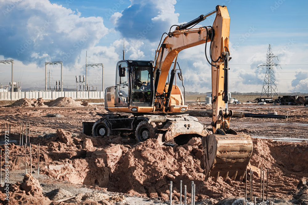 Construction site with heavy machinery digging in the ground during daylight near power lines
