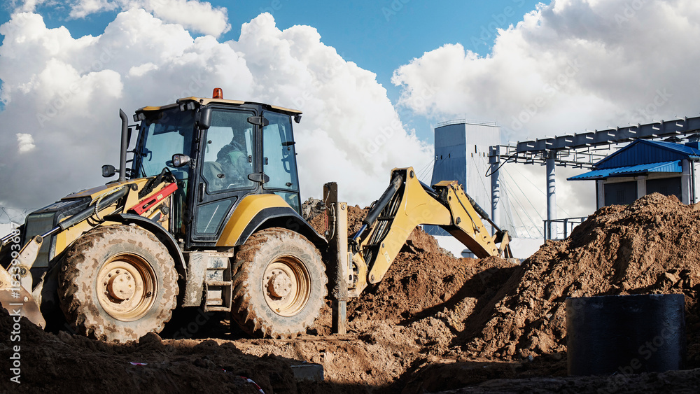 Construction machinery works on a building site with clouds in the background during daylight hours