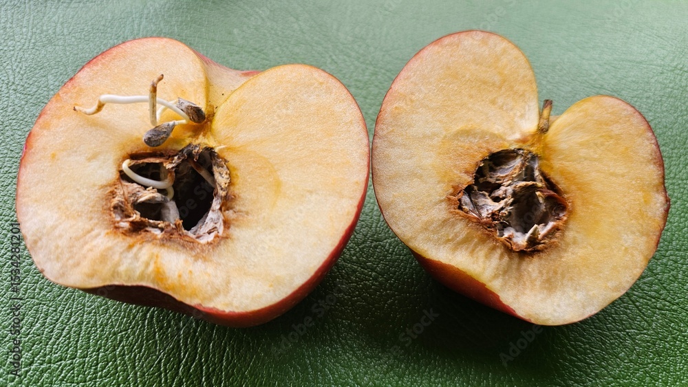 A red apple that is cut in half and has sprouts growing from the seeds in the middle, the middle is brownish black because it has been ripe for too long.