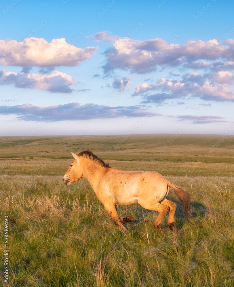 A wild stallion runs across the steppe.