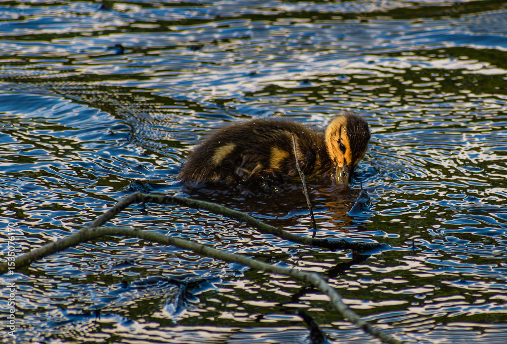 Duckling Swimming in Rippling Water with Branches in Foreground