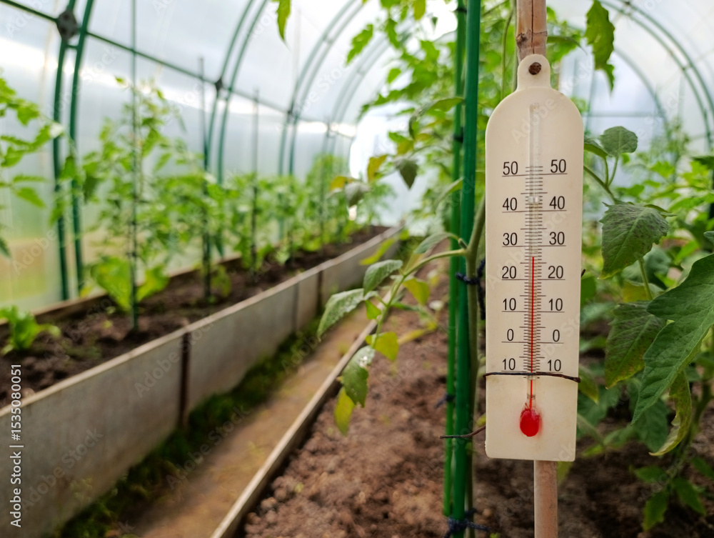 Thermometer in the greenhouse with tomatoes on a summer day. Measuring air temperature in agriculture