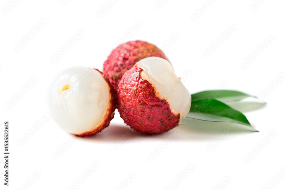 Three Juicy Lychee with cut in half and leaves isolated on white background.