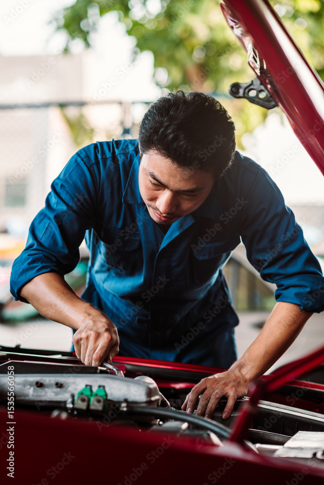 Auto Technician Inspecting Car Engine Compartment for Maintenance and Safe Vehicle Operation in Small Garage Business