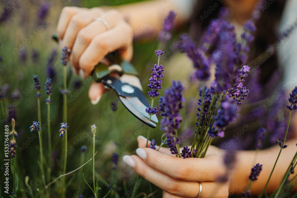 Young caucasian woman is cutting lavender at her home garden during the day