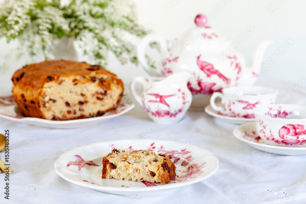 Traditional Irish Halloween Homemade fortune-telling Bairín Breac or Barmbrack Bread or Tea Break with honey butter