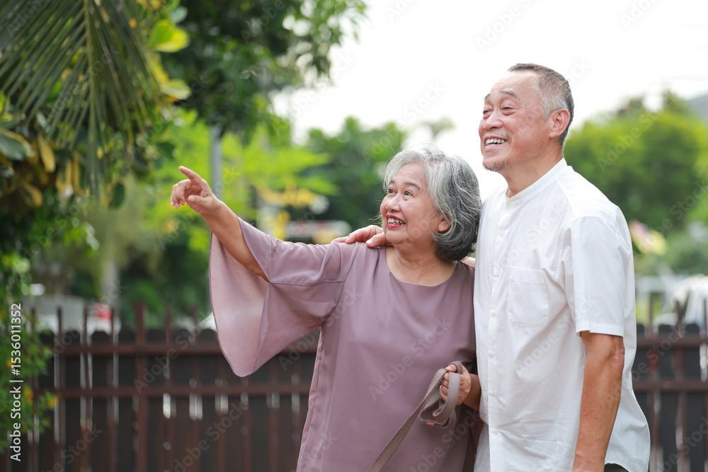 Asian elderly couple hugging each other living together in retirement. Both are smiling happily looking forward together. Health care in the elderly.