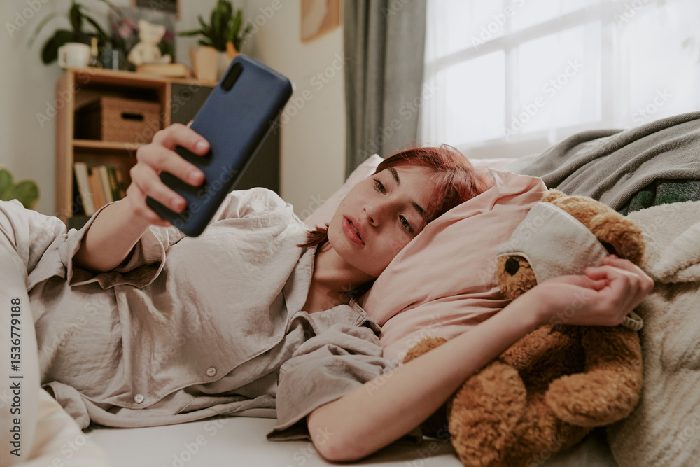 Young woman relaxing on cozy bed, engaging with her smartphone. She seems engrossed in her activity while lying comfortably, surrounded by personal items and stuffed animals