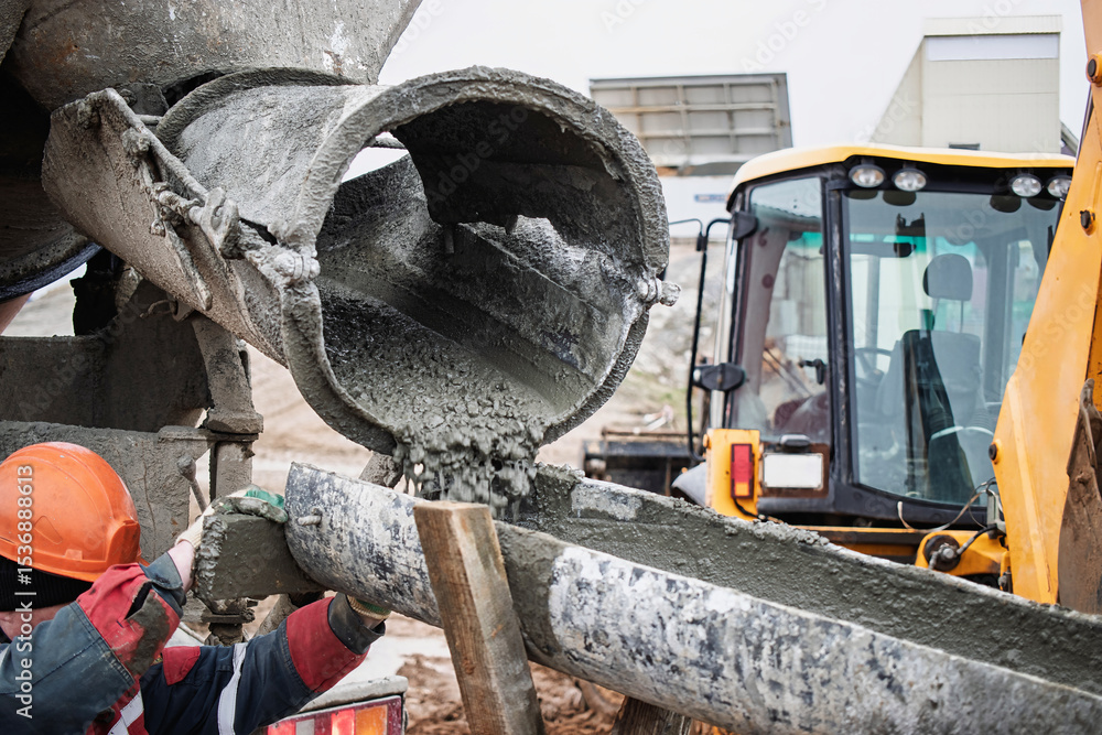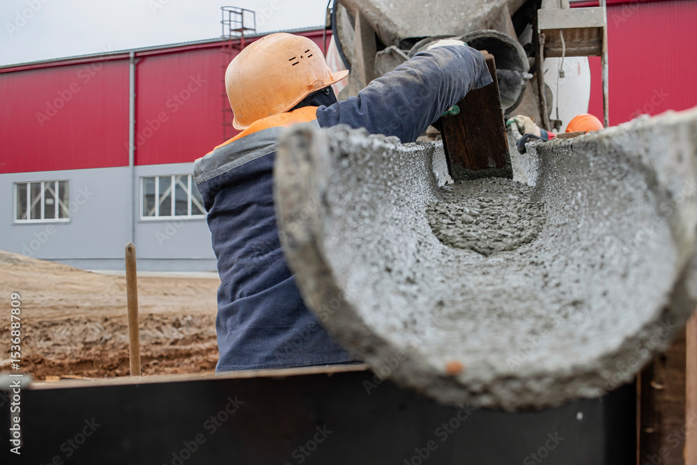 Construction worker pouring concrete into drainage pipe at a building site during overcast weather