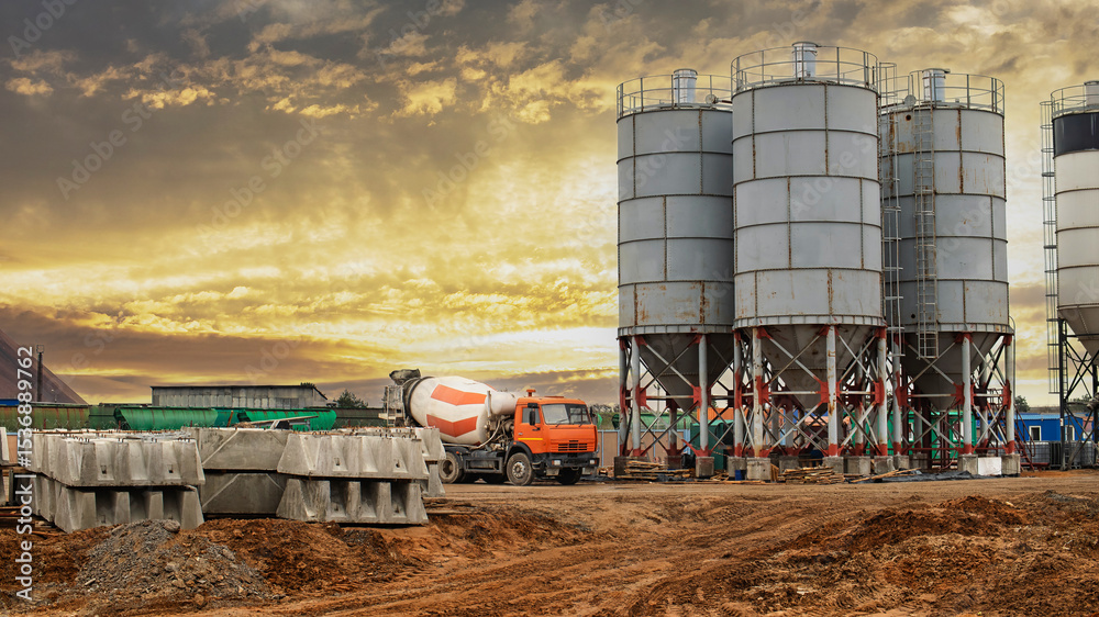Construction site at sunset with cement silos and mixer truck amidst cloudy sky