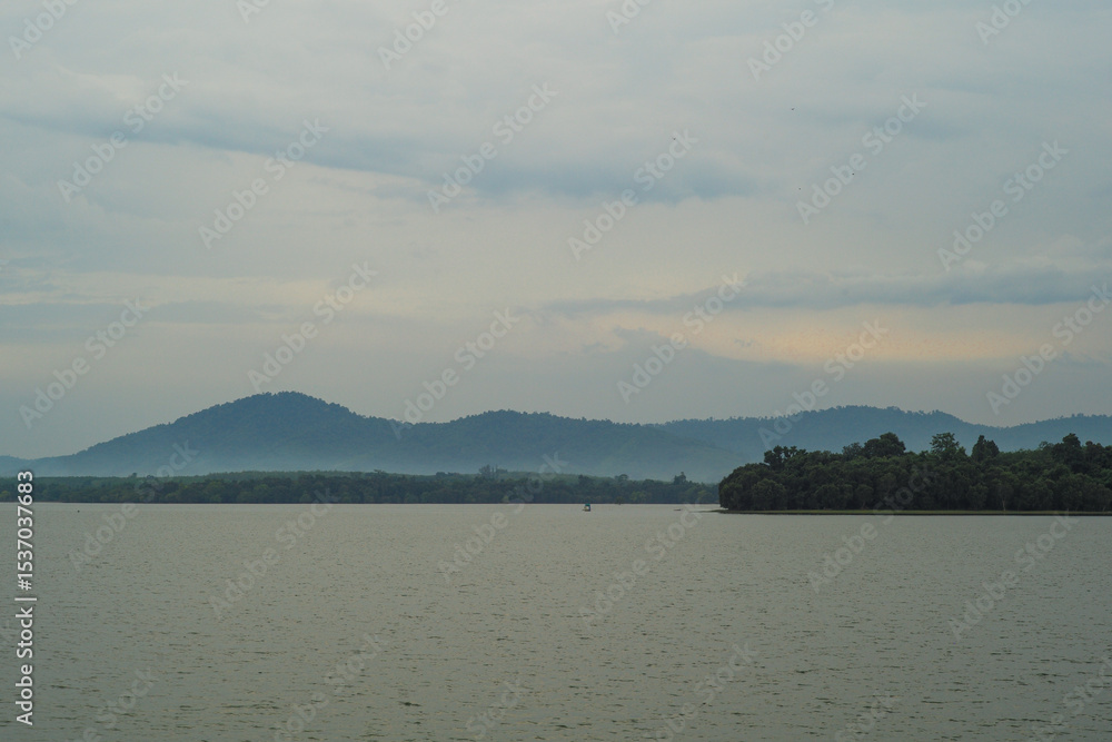 Panorama view of many layers of the mountains with the peaceful lagoon in foreground