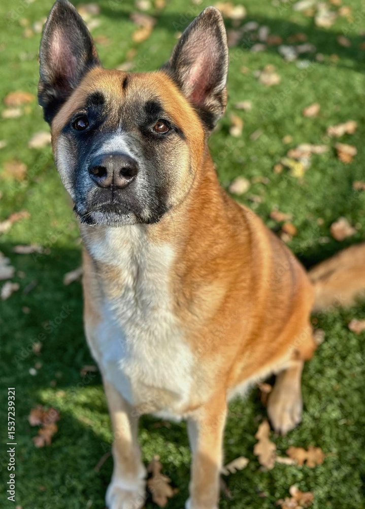 Boxer Shepherd Mix Dog Sitting Outdoors on Grass
