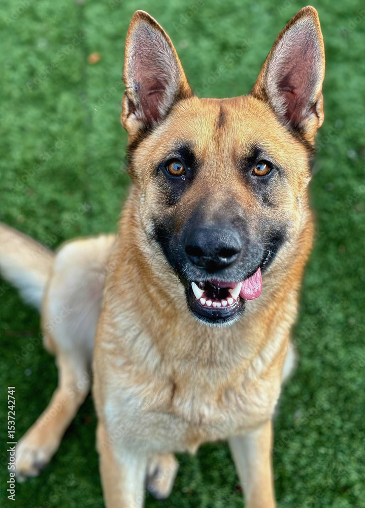 Belgian Malinois Mix Sits with Tongue Out on Turf