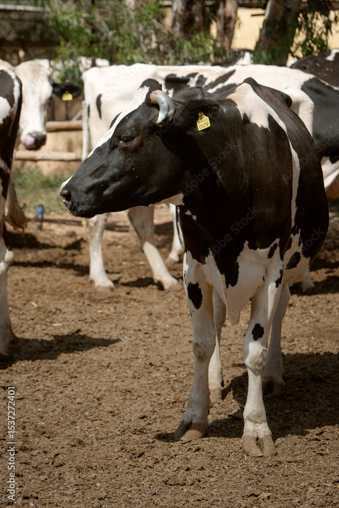 full-length black and white cow photo. The topic of animal husbandry, cattle and veterinary medicine