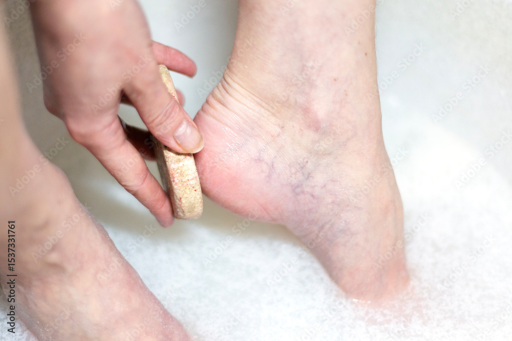 A woman takes care of her foot and heel with a pumice stone. A woman uses a pumice stone to remove hardened skin on her heel.