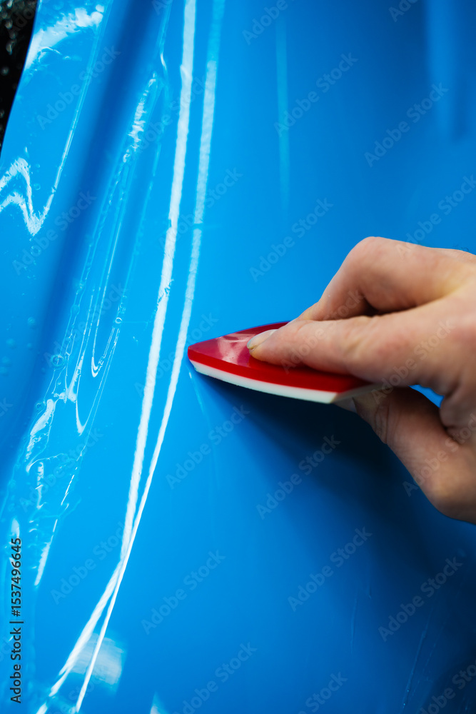 Applying a high-gloss blue PPF using a red squeegee ensures a bubble-free, smooth surface of car. Blue PPF applied with red squeegee during detailing car to preserve finish and block damage.