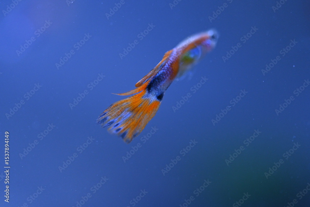 A guppy in an aquarium, photographed with a macro lens.