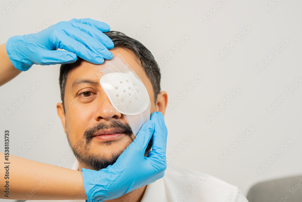 A doctor's hand wearing blue medical gloves is applying a bandage to an adult patient's eye.