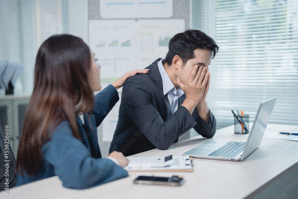 Businesswoman providing comfort to her stressed male colleague in the office, demonstrating empathy and support during challenging times in the corporate environment