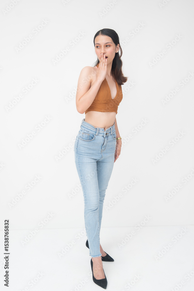 Surprised young woman in casual outfit with hand covering mouth, isolated on plain white background