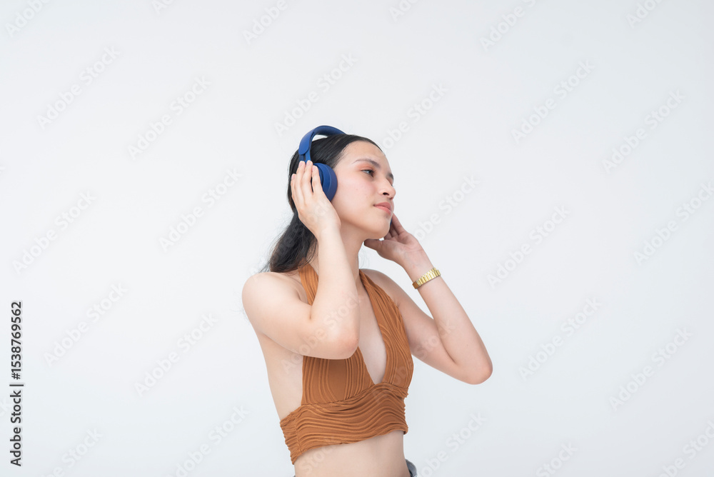 Relaxed young woman enjoying music wearing headphones, dressed in stylish attire, isolated on a white background