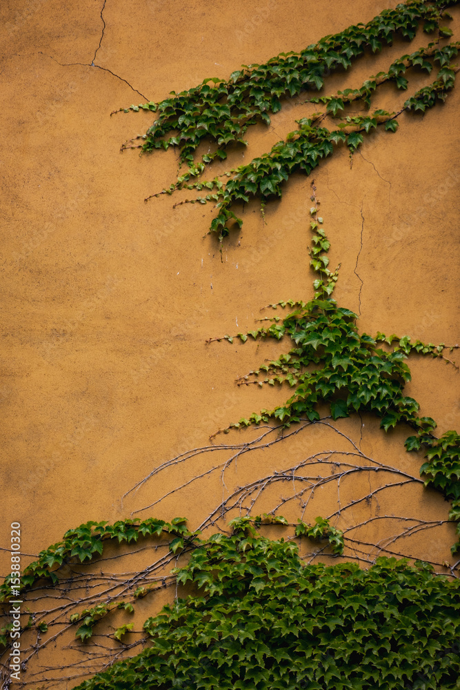 Vibrant green ivy spreading on aged yellow wall with cracks, nature and urban contrast background