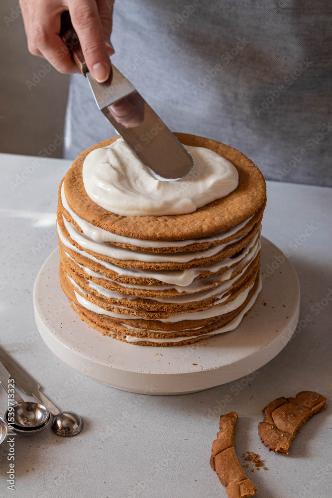 Woman makes, prepares layer honey cake, medovik. The pastry chef spreads cream on the cake. Culinary, baking and cooking food concept. Cooking lesson. Home cooking. Selective focus.