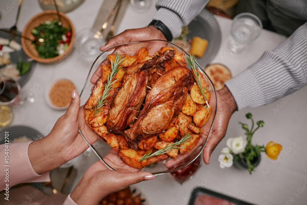 Top view of female hands holding large plate of roasted chicken and vegetables passing dish during festive dinner with side dishes over garnished table setting