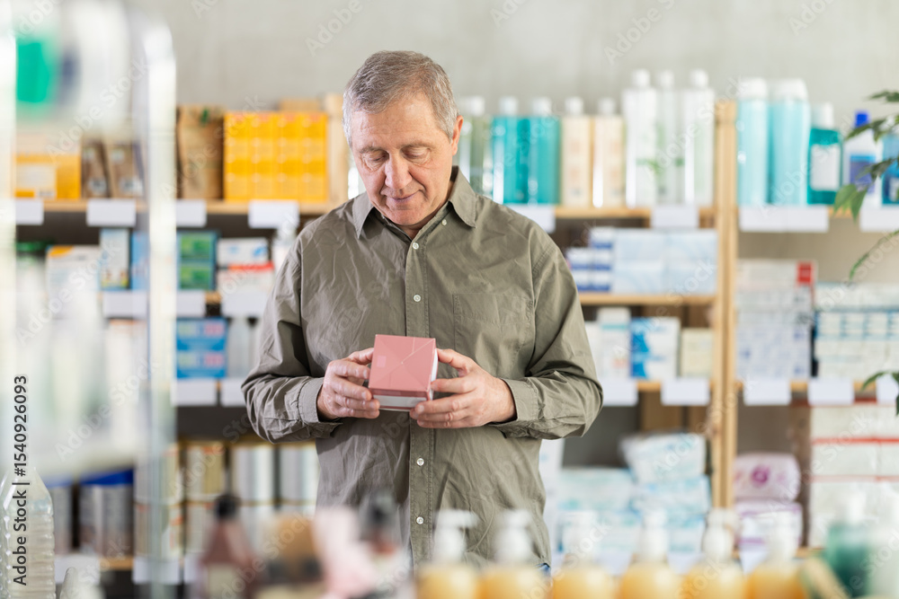 Senior man buys emollient cream at pharmacy and compare with other medicine, carefully reads patient information, checks composition of drug. Checks for absence of harmful substances, view product in