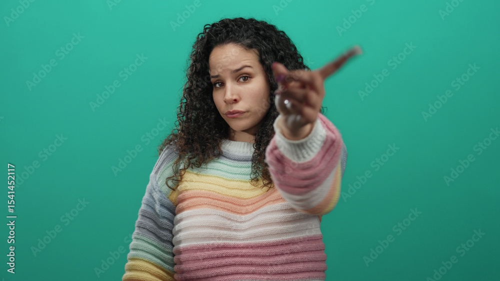 Woman gesturing no with hand towards camera against isolated green background, wearing colorful sweater, conveying rejection with serious expression.