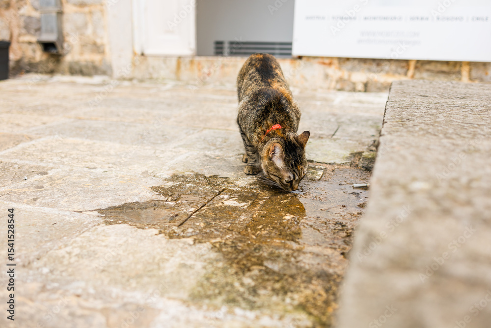 Tabby cat drinking from a puddle on a stone pavement. Thirst, survival instinct, and everyday street life of urban animals.