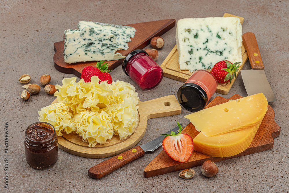 Cheese assortment on wooden boards with strawberries, nuts and jam on stone background
