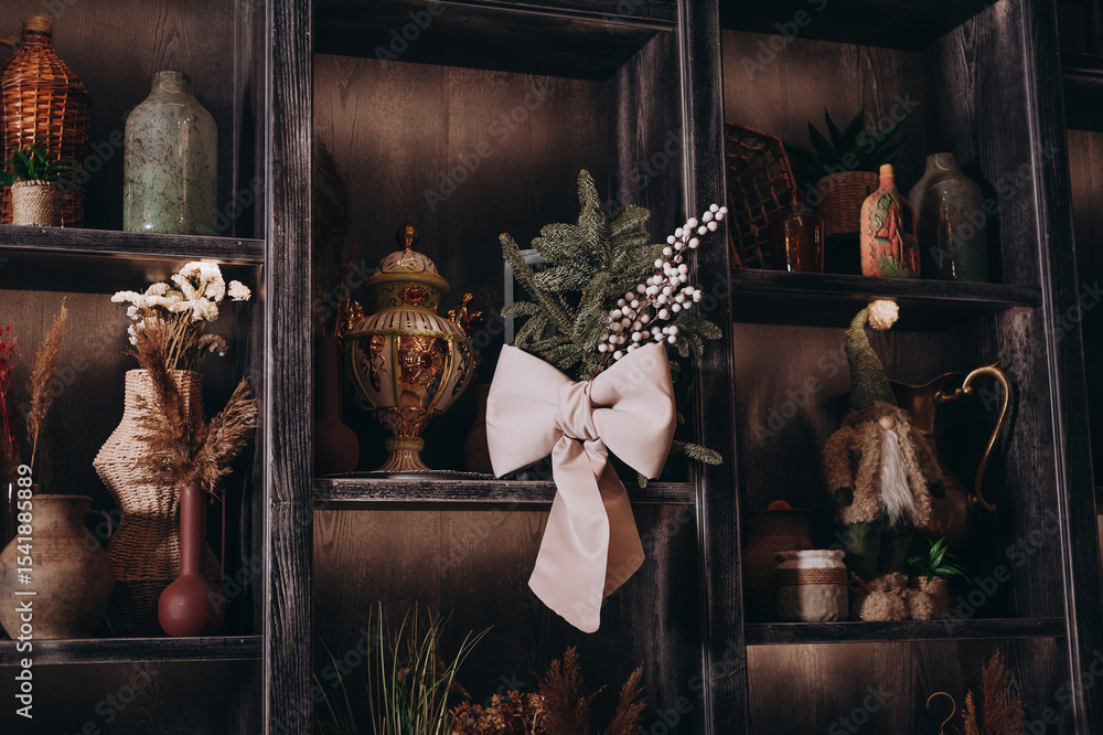 A richly textured, dark wooden shelving unit displaying a charming assortment of rustic, vintage, and holiday decorations, including a samovar, a fir branch with a bow, and a gnome figurine.