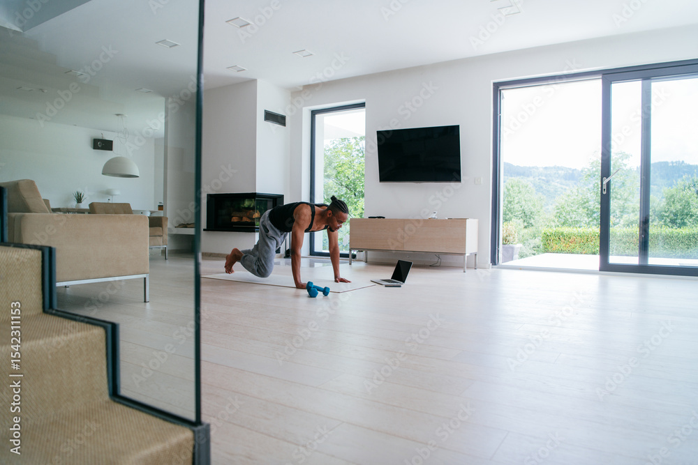 Training At Home. Sporty african american man doing the training while watching an online tutorial on a laptop, exercising in the living room, free space.