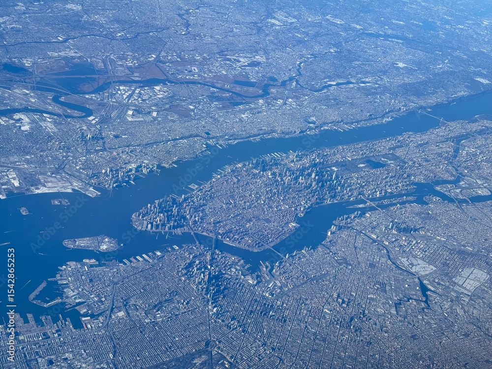 Aerial view of Manhattan, New York, a major city on the East Coast of the United States. Below you can see Governors Island in the Hudson River and the entire Manhattan