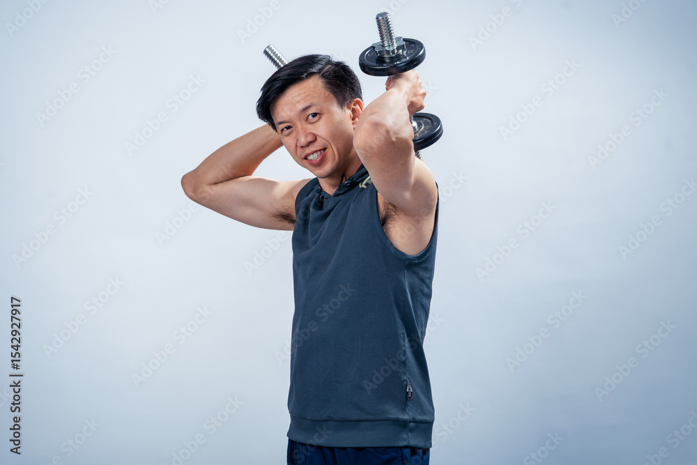 Asian man in sleeveless hoodie lifting dumbbell behind head with both arms, smiling confidently while exercising in studio with plain light background, showing strength and positive attitude