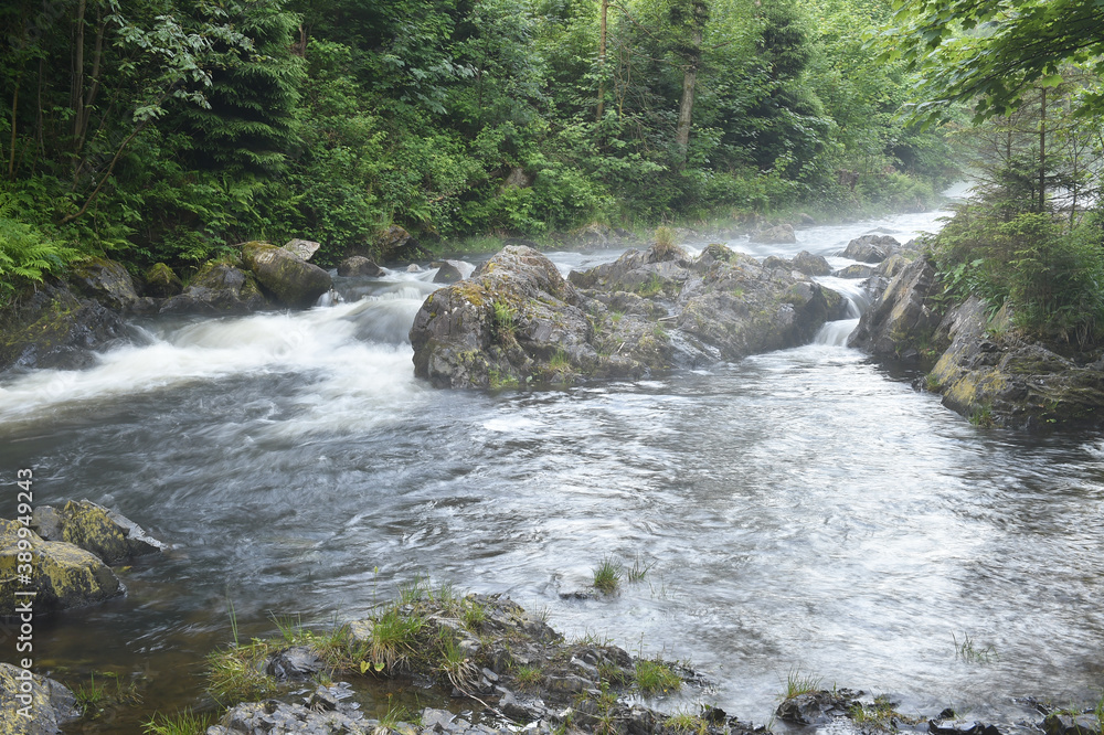 Panoramic mountain landscape with rocky terrain and vibrant greenery under a blue sky