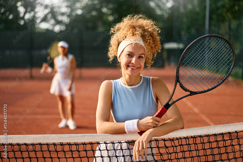Confident female tennis player leaning on net after match