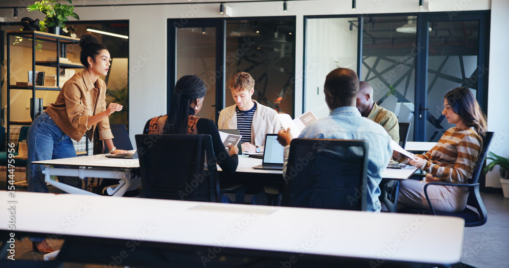 Presentation, speaker and teamwork with business woman in office for workshop, meeting and idea. Planning, collaboration and teaching with employees in agency for support, advice and brainstorming