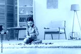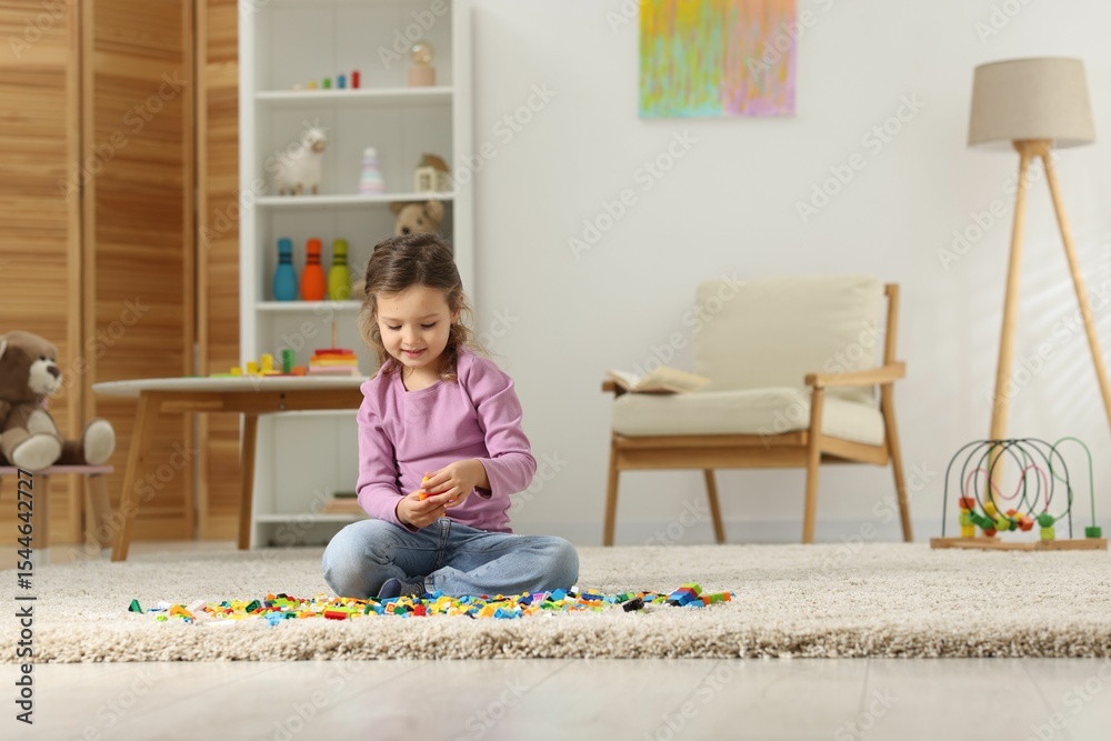 Cute girl playing with building blocks on floor at home. Space for text