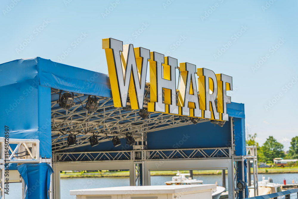 The bold Wharf sign stands out on a sunny day, marking an active waterfront event area.