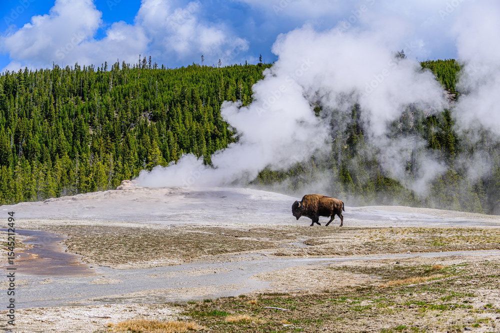 Bison walking in front of Old Faithful