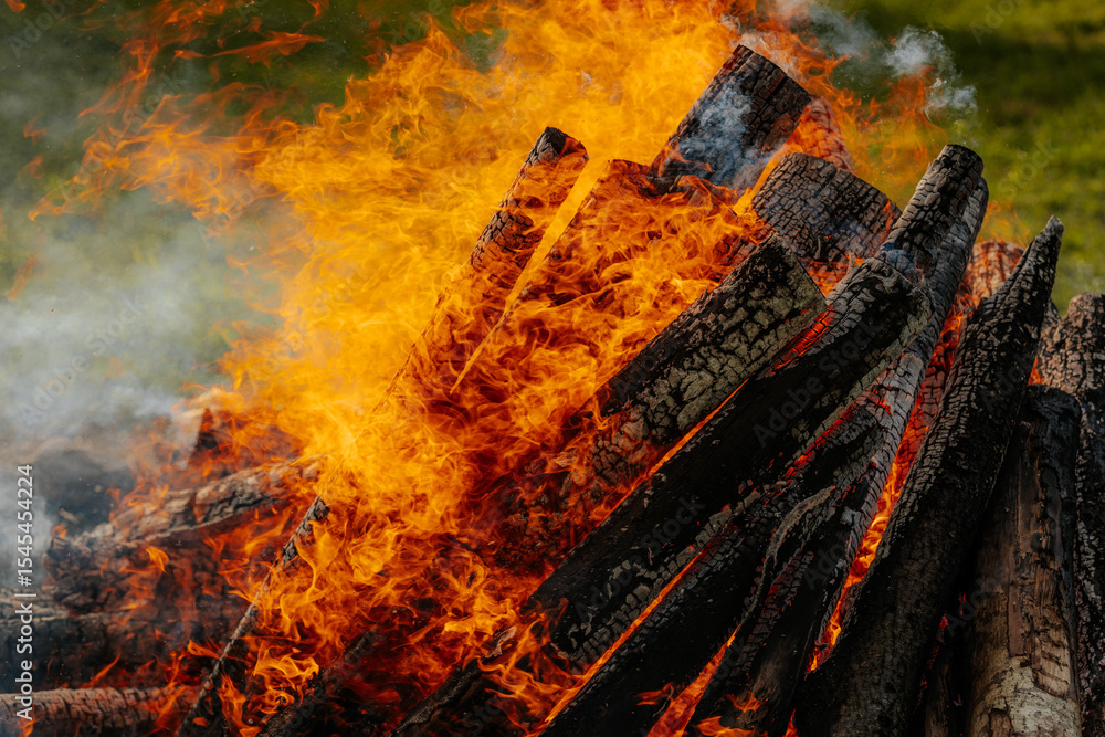 Intense orange flames engulf burning firewood in a large bonfire, with vivid textures of charred logs and swirling heat.
