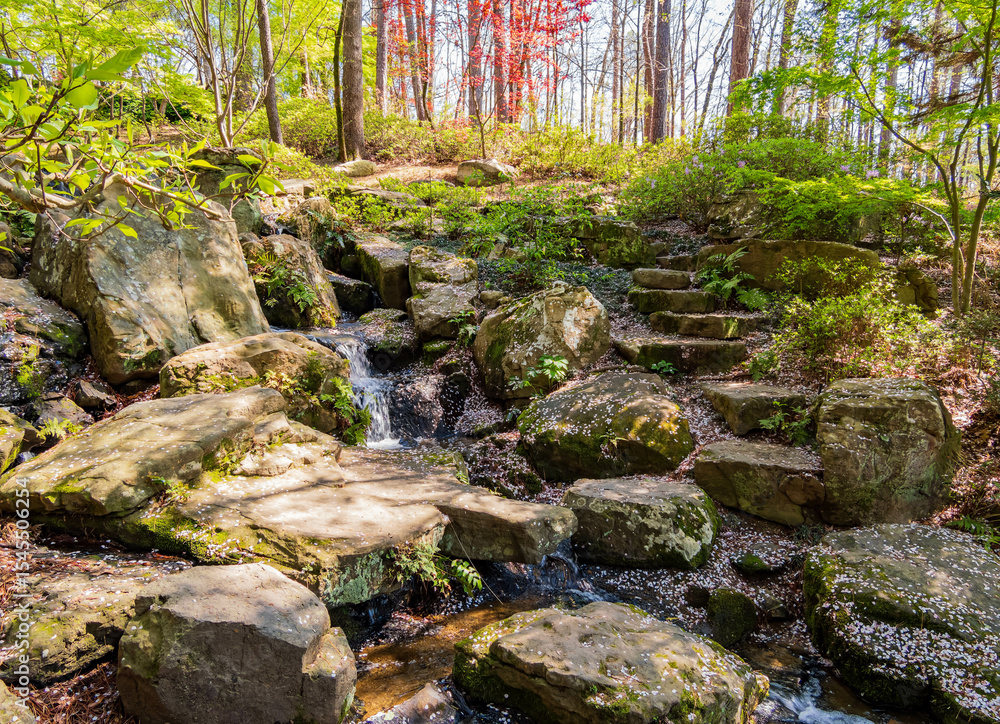 Sunny and beautiful natural landscape with cherry pedal on rocks around Garvan Woodland Gardens