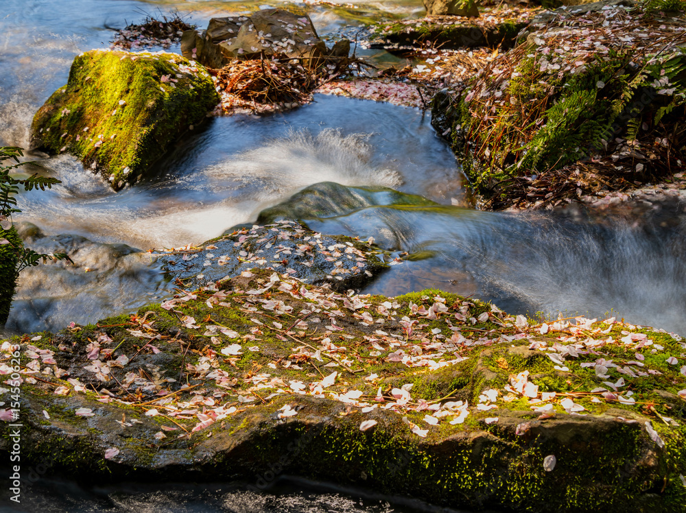Sunny and beautiful natural landscape with cherry pedal on rocks around Garvan Woodland Gardens