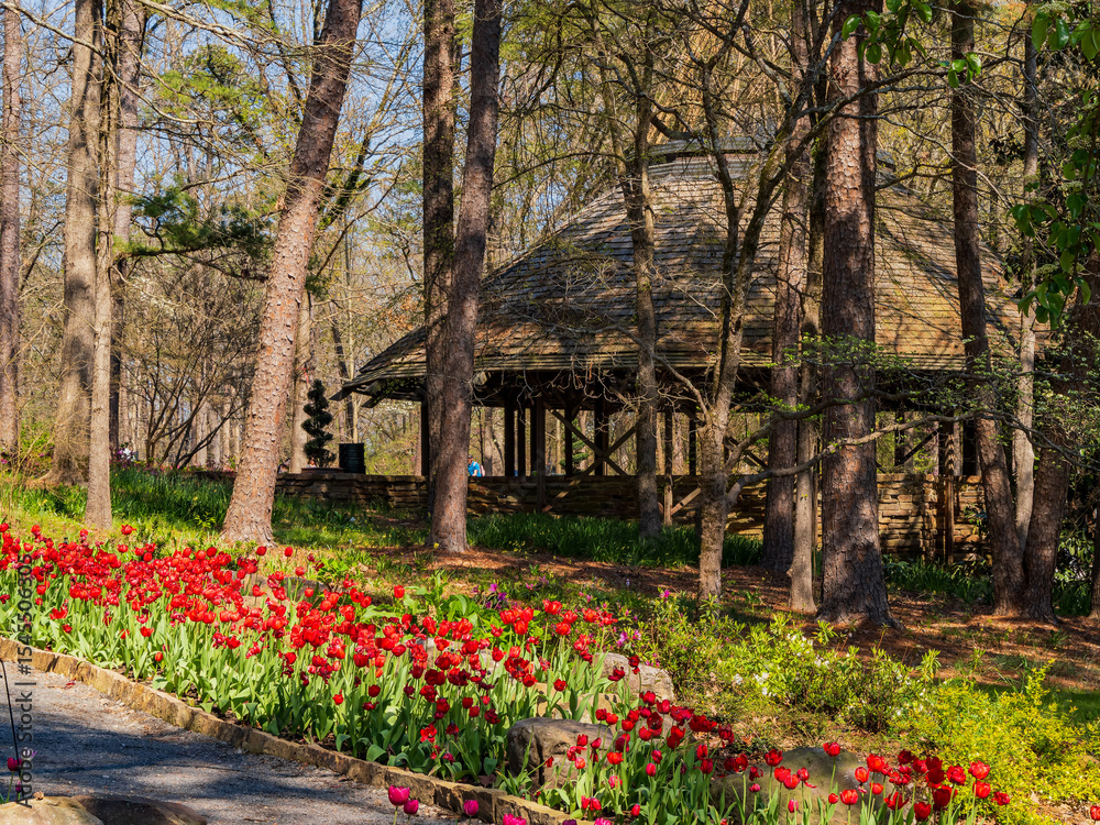 Sunny and beautiful natural landscape and tulips blossom around Garvan Woodland Gardens
