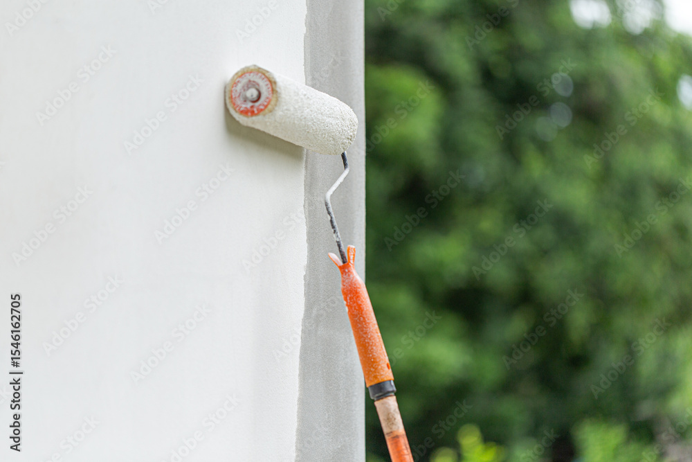 Painting an exterior wall with a white paint roller brush, outdoor home renovation concept.